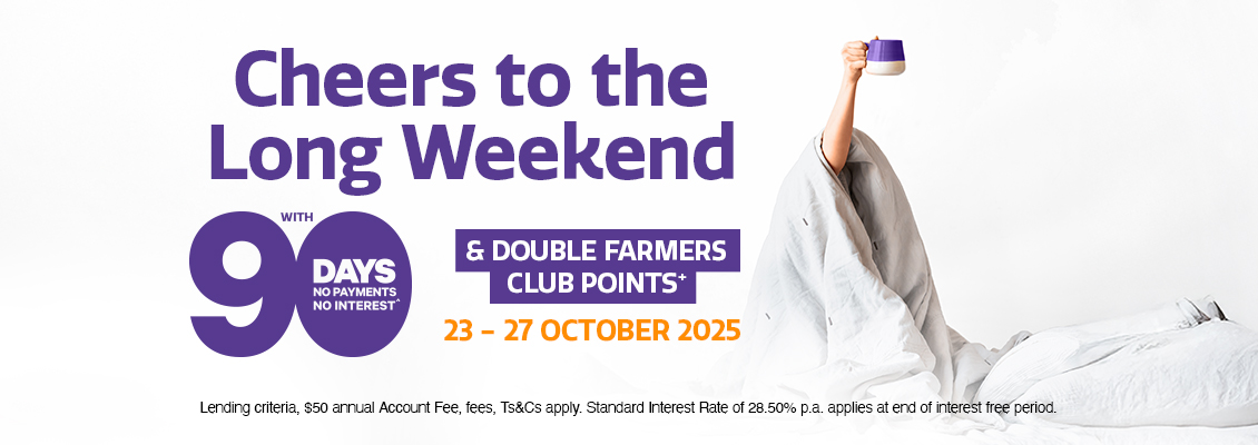 This long weekend, from Thursday 23 October to Monday 27 October 2025, enjoy Double Farmers Club points+ and 90 days no payments, no interest^ on all your Farmers Mastercard purchases.