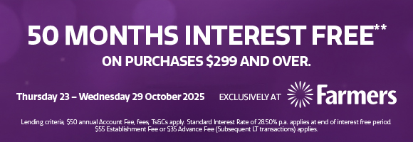 **50 months interest free is available on Long Term Finance (LTF) for in-store an online purchases at Farmers from 12.01am from Thursday 23 October to 11.59pm Wednesday 29 October 2025 New Zealand local time. Min spend $299. Lending criteria, $50 annual Account Fee, fees, Ts&Cs apply. $55 Establishment Fee applies to your first Long Term Finance (LTF) transaction, $35 Advance Fee applies to subsequent LTF transactions. Min payments of 3% of the monthly closing balance or $10 (whichever is greater) are required throughout interest free period. Paying only the minimum monthly payments will not fully repay the loan before the end of the interest free period. Standard Interest Rate of 28.50% p.a. applies to outstanding balance at the end of LTF interest free period. Other interest rates and fees may apply. Rates and fees subject to change. Columbus Financial Services Limited reserve the right to amend, suspend or terminate the offer and these Ts&Cs at any time without notice.