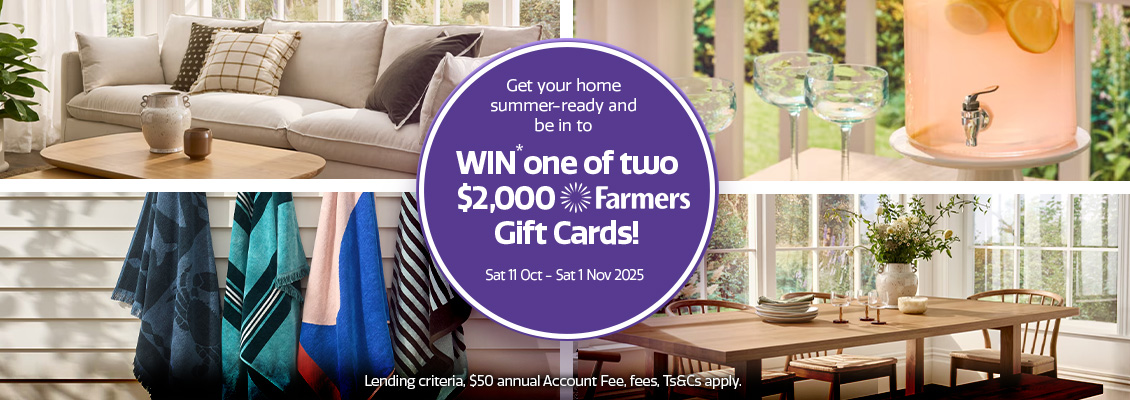 Shop with your Farmers Mastercard from Saturday 11 October to Saturday 1 November 2025 and every purchase puts you in the draw to WIN* one of two $2,000 Farmers Gift Cards to help get your home summer-ready.