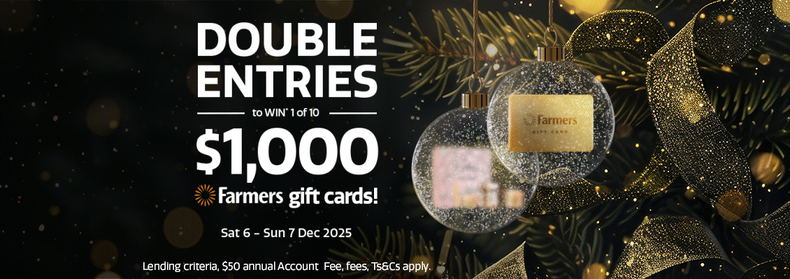 This weekend, from Saturday 6 to Sunday 7 December 2025 every time you shop in-store or online with your Farmers Mastercard, you’ll get DOUBLE ENTRIES into the draw to win* one of ten Farmers $1,000 gift card.