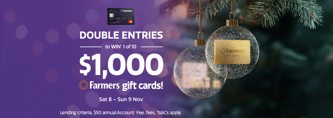 This weekend From Saturday 8 to Sunday 9 November 2025 every purchase on your Farmers Mastercard gives you TWO entries in the draw to WIN* a $1,000 Farmers Gift Card. There are 10 to be won*!